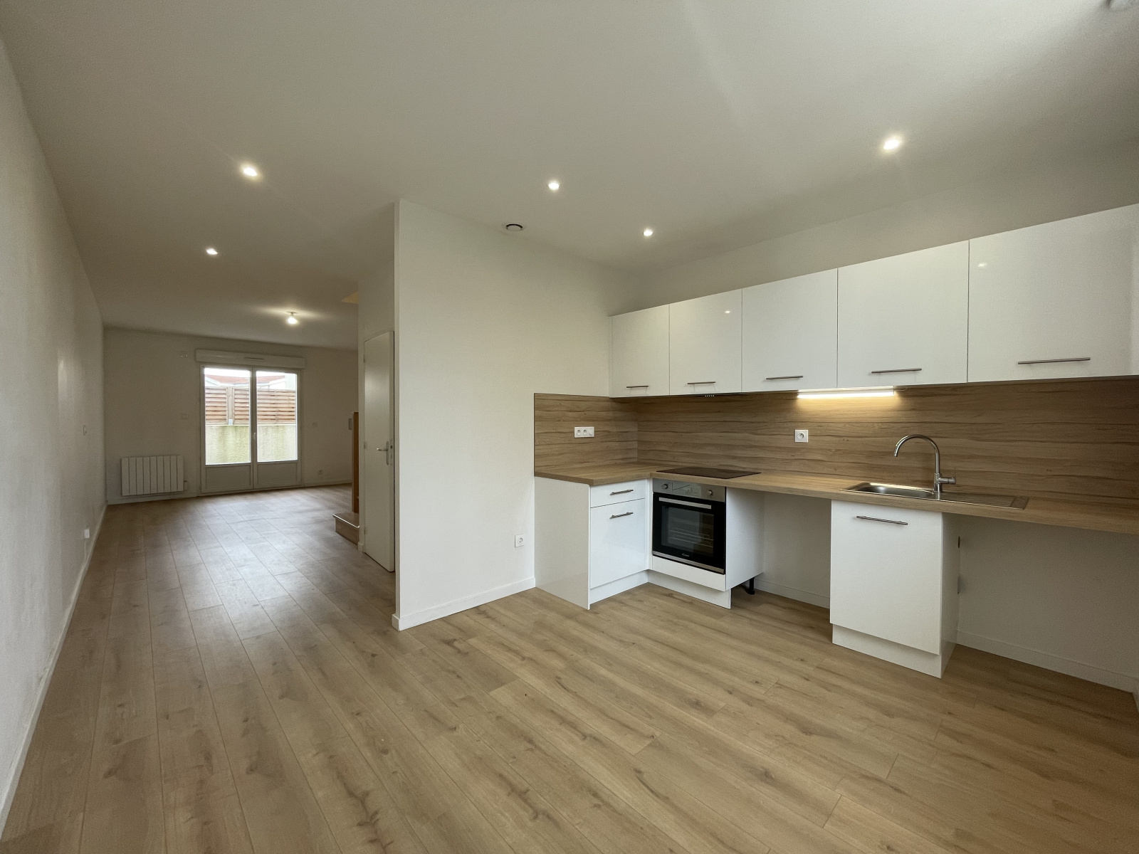 La cuisine ouverte, entièrement aménagée et équipée (four, plaque, hotte, rangements), s’intègre harmonieusement à l’espace.
