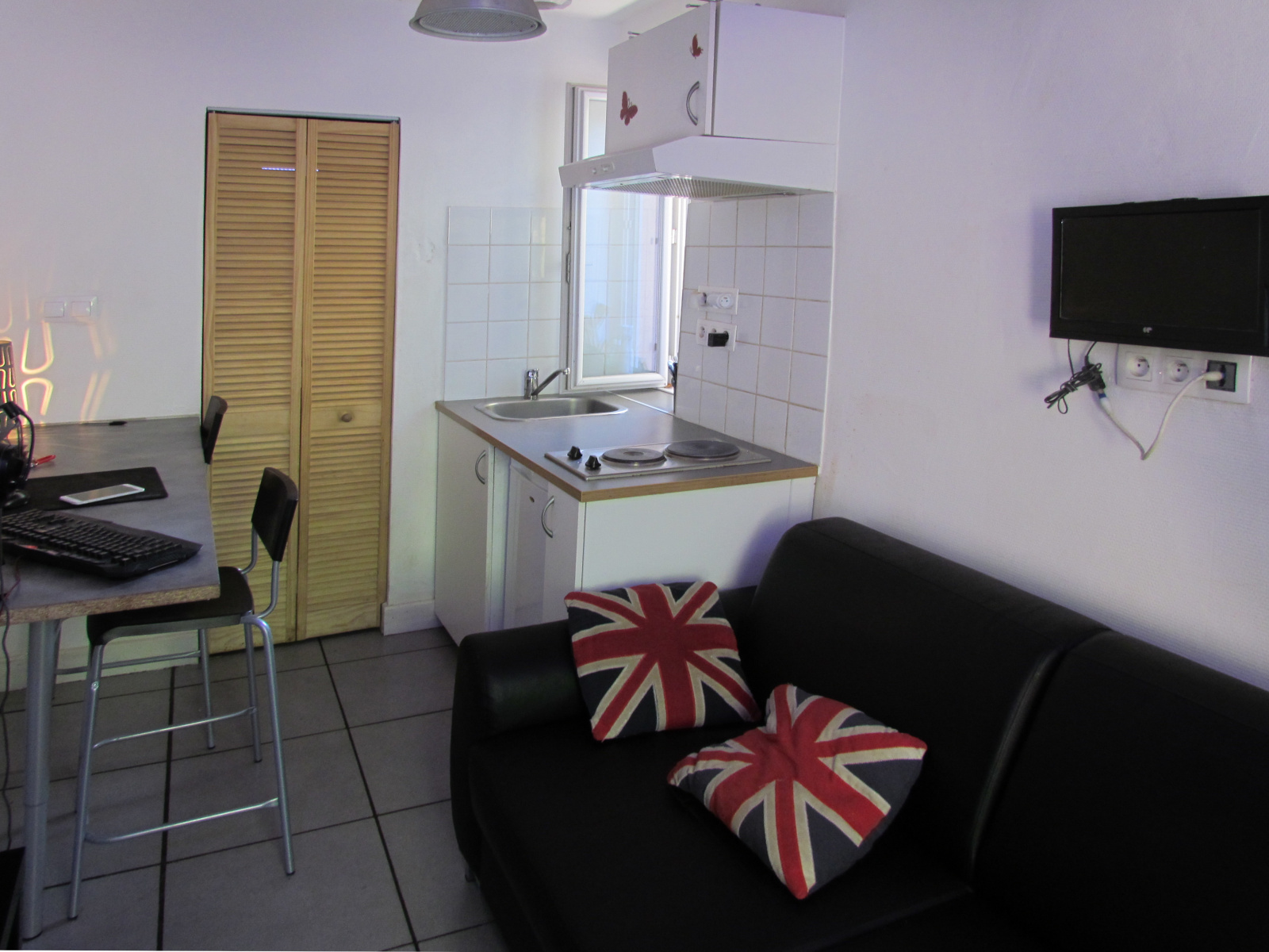 Cuisine semi équipée : éléments haut / bas, plaque électrique, frigo, micro-onde