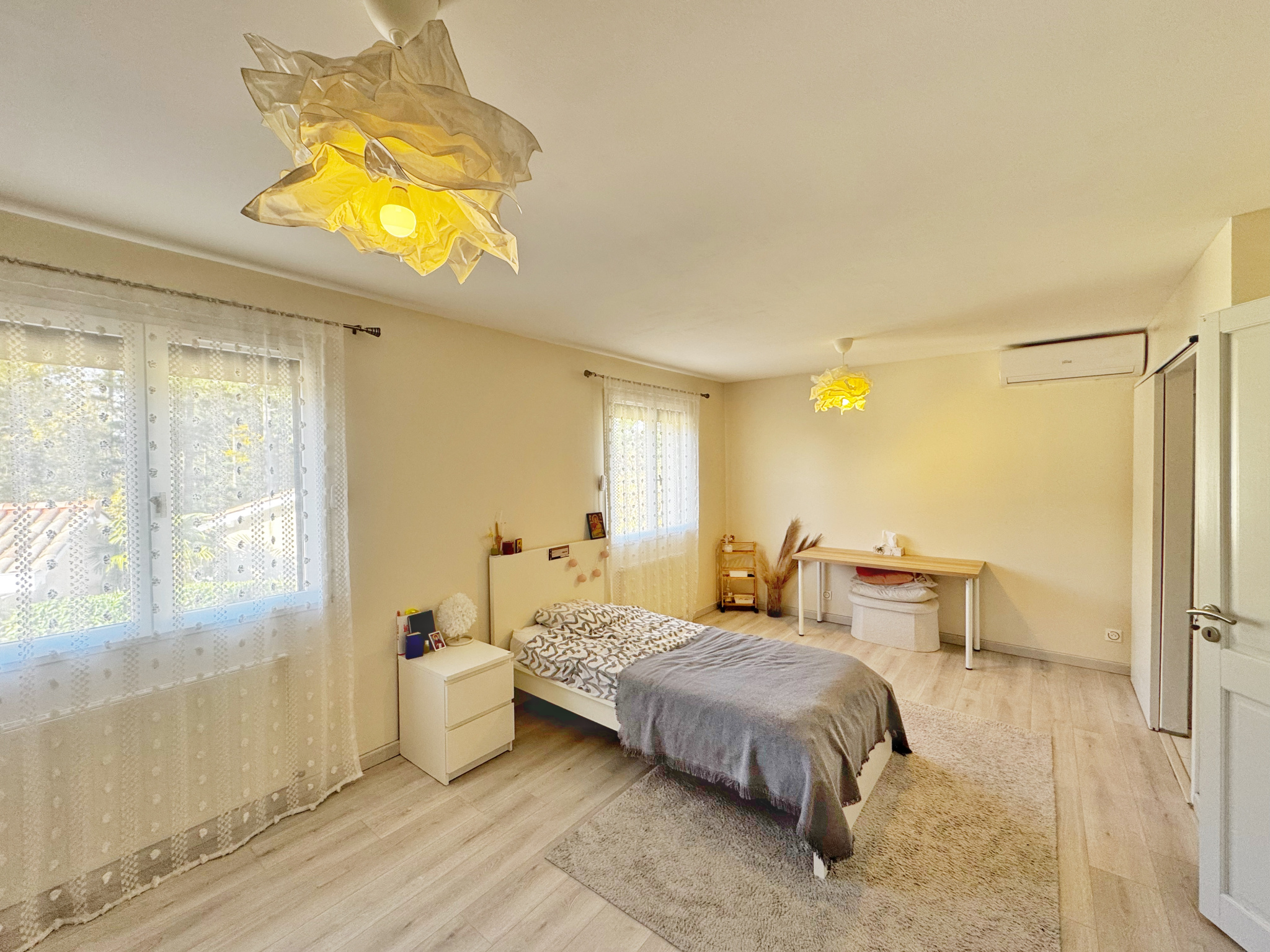 Elle se compose d’un grand et lumineux séjour de 60 m² avec sa cuisine moderne et entièrement équipée, de 4 grandes chambres possédant chacune leurs salles d’eau (dont une avec baignoire) et de 4 WC ainsi qu’une buanderie, une salle de sport et un bureau.