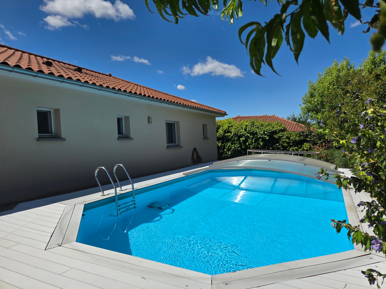 L’extérieur est entièrement clos et arboré, on y retrouve 2 belles terrasses et une grande piscine avec dôme de protection